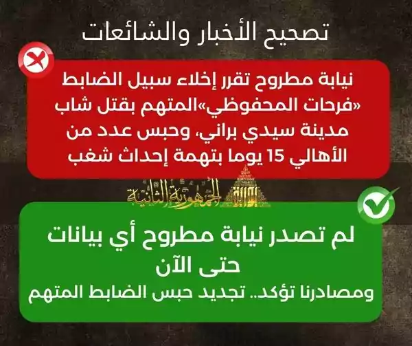 انتشرت بعض الأخبار والشائعات بالأمس على مواقع التواصل الاجتماعي، بعد حادث سيدي براني بمرسى مطروح، ووفاة أحد المواطنين بعد إطلاق ضابط شرطة النار عليه، أنه تم إخلاء سبيل الضابط والتحفظ على بعض الأهالي.