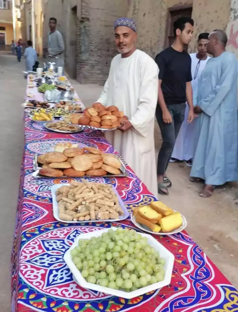 ضيافة منوعة من المعجنات والشاي بلبن وحلوى، لمصليي عيد الأضحى في ساحة الصلاة بنجع الدار بمدينة الطود في الأقصر.