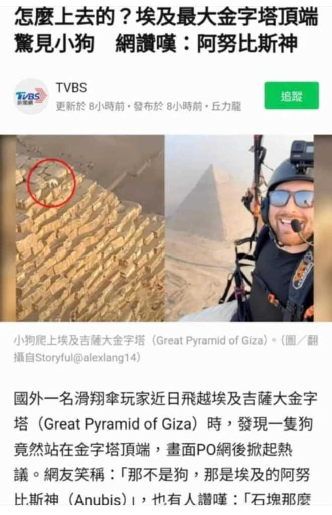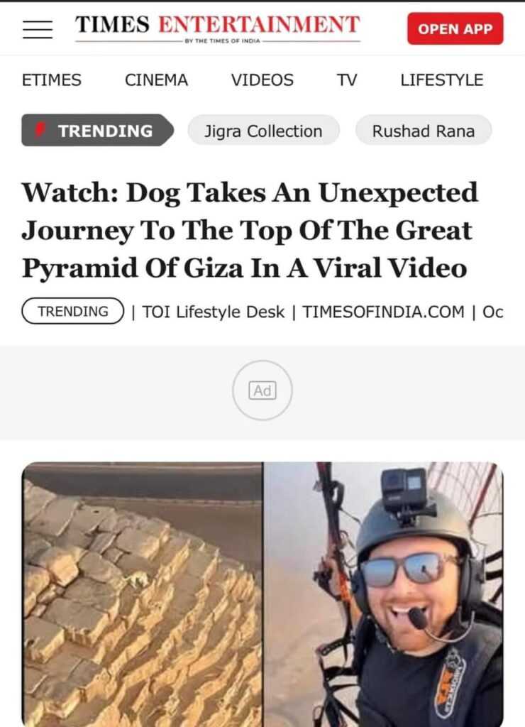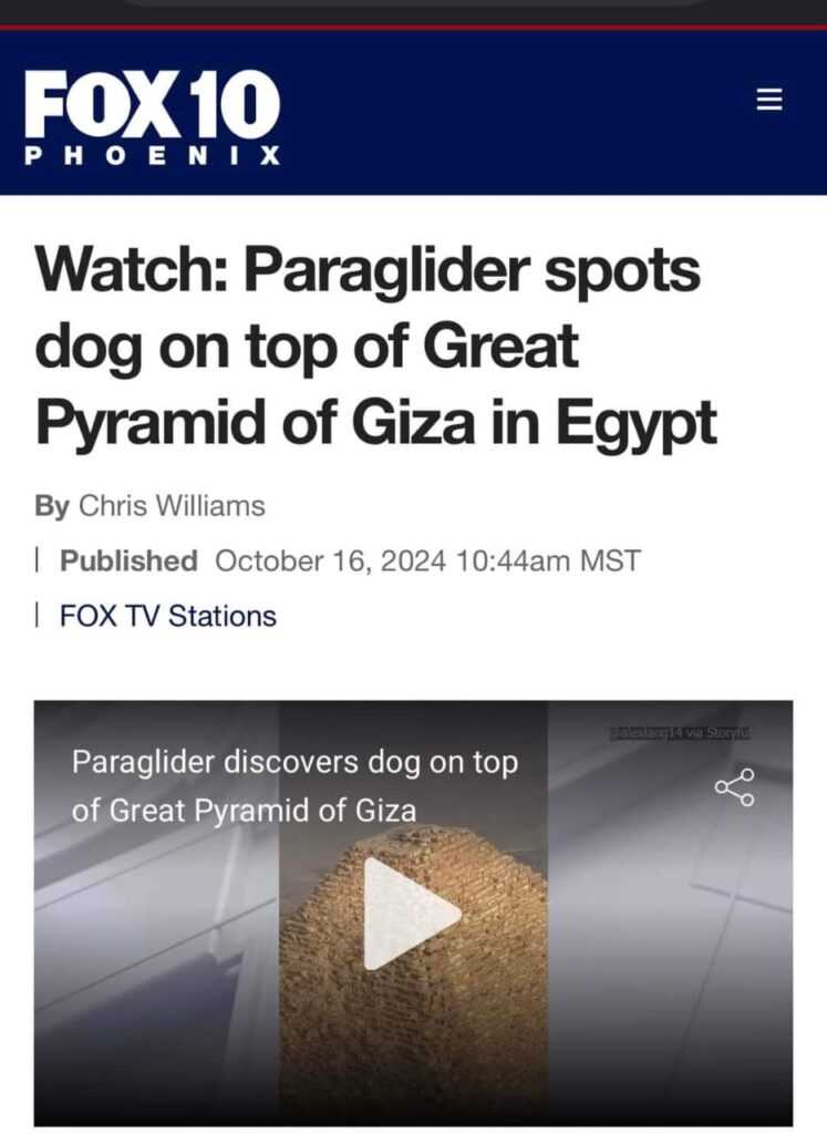 انتشر فيديو بصورة غير عادية بسرعة على وسائل التواصل الاجتماعي وحصل على آلاف الإعجابات، حيث اكتشف طيار مظلي بالصدفة كلبًا يتجول حول قمة الهرم الأكبر في مصر والذي يبلغ ارتفاعه 138 مترًا.