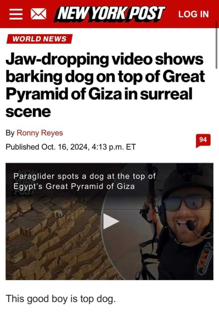 ونشرت صحيفة “نيويورك بوست” خبر بعنوان” فيديو صادم يظهر كلبًا ينبح فوق الهرم الأكبر بالجيزة في مشهد سريالي”، وتابع الخبر.. شاهد رجل أثناء طيرانه بالمظلة فوق الهرم الأكبر في الجيزة في مصر يوم الاثنين مشهدًا مذهلًا لكلب ينبح فوق أقدم عجائب الدنيا السبع.