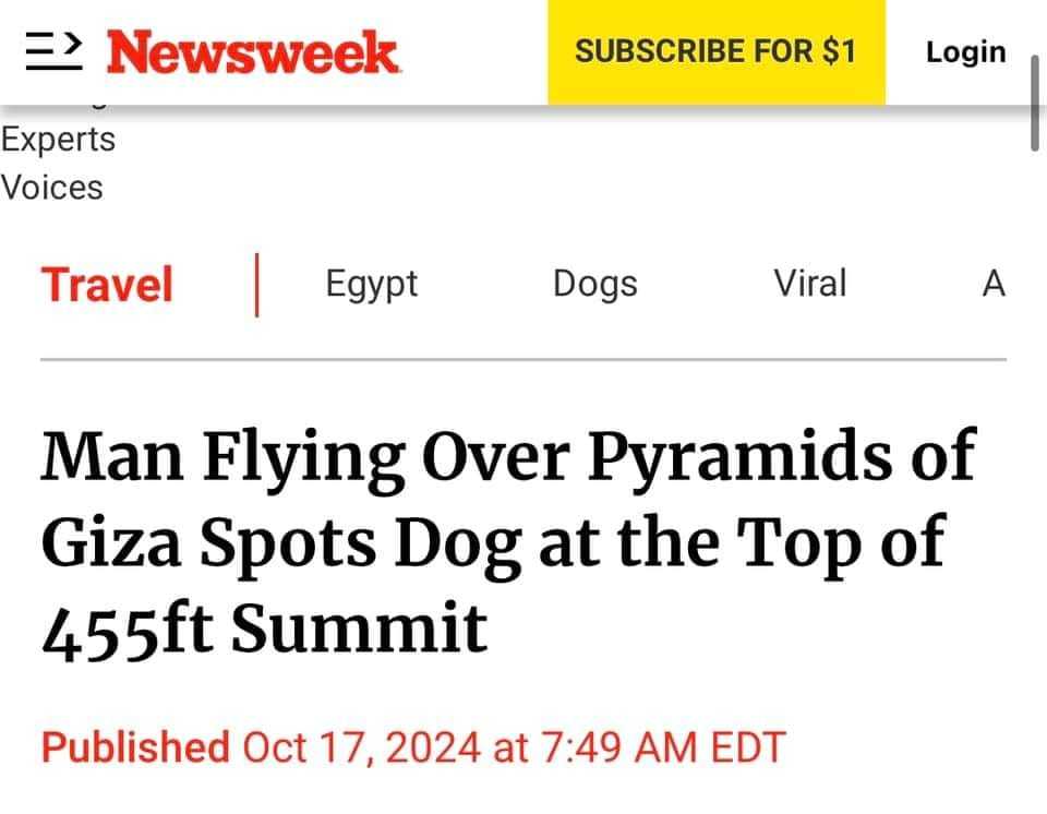فيما نشر موقع نيوزويك خبر عنوانه “رجل يحلق فوق أهرامات الجيزة ويرى كلبًا على قمة ارتفاع 455 قدمًا”