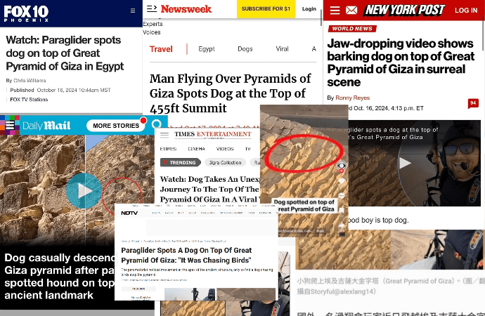 هذا بالإضافة إلى العديد من المواقع العالمية التي نشرت اخبار ومقطع الفيديو الذي يظهر الكلب أعلى قمة الهرم، وقال أحدهم ستظل مصر بلد العجائب.