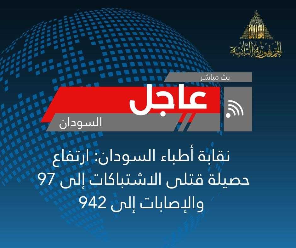 أعلنت نقابة أطباء السودان ارتفاع حصيلة قتلى الاشتباكات الى 97 قتيل و942 مصاب.