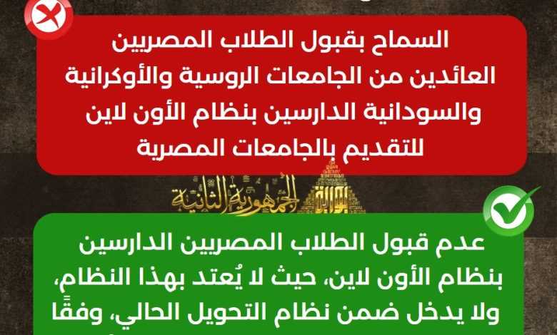 تصحيح شائعة السماح بقبول الطلاب المصريين العائدين من الجامعات الروسية والأوكرانية والسودانية الدارسين بنظام الأون لاين للتقديم بالجامعات المصرية