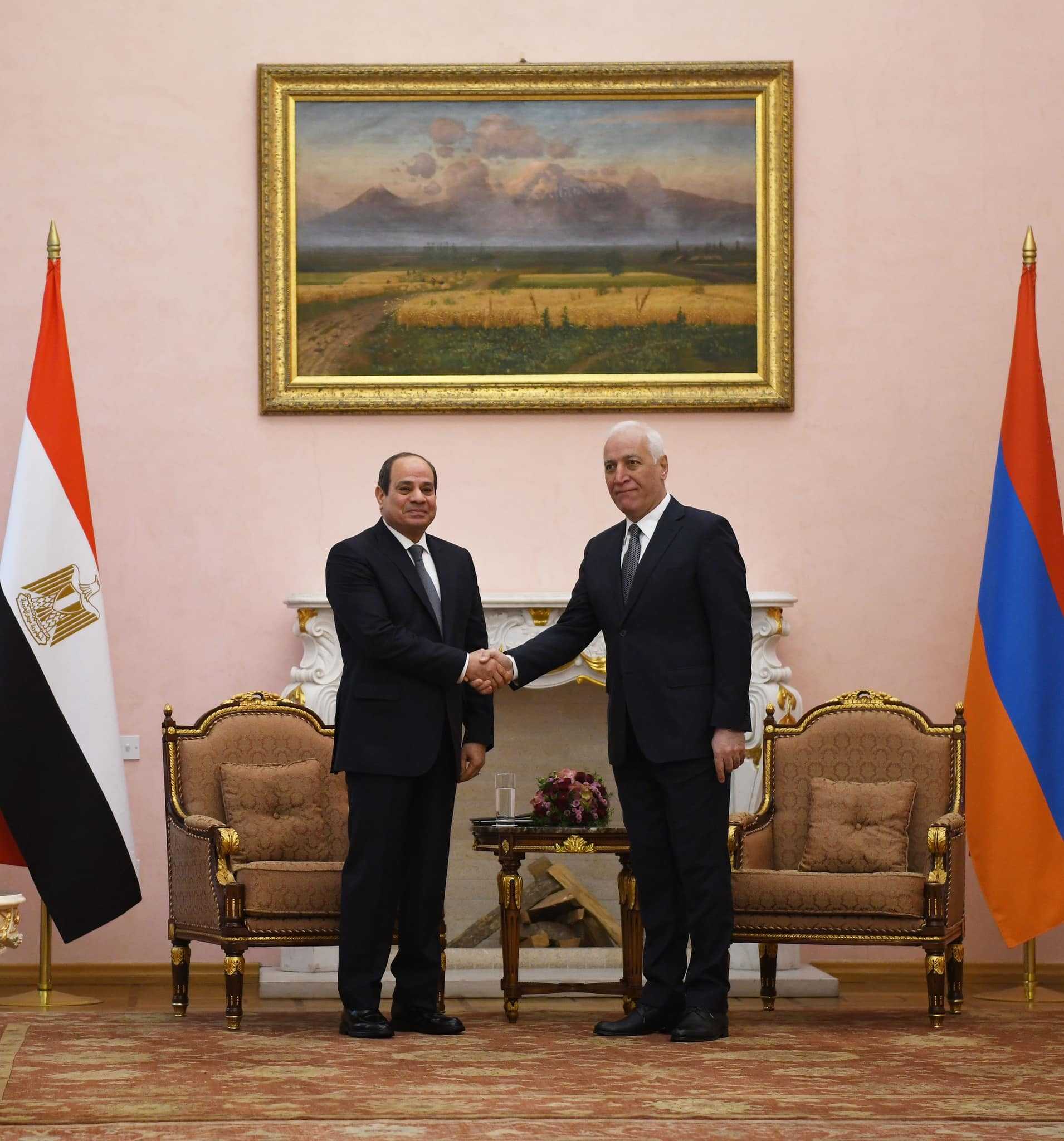 وصرح المتحدث الرسمي باسم رئاسة الجمهورية بأن الرئيس أجرى مباحثات مغلقة مع الرئيس الأرميني تبعتها جلسة مباحثات موسعة ضمت وفدي البلدين، حيث رحب الرئيس الأرميني في مستهلها بالزيارة التاريخية للرئيس، معرباً عن تقدير أرمينيا لمصر على المستويين الرسمي والشعبي، واعتزازها بالروابط الممتدة التي تجمع بين البلدين الصديقين.