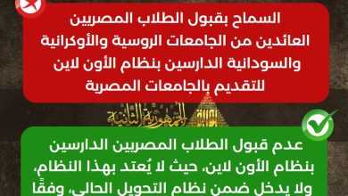 تصحيح شائعة السماح بقبول الطلاب المصريين العائدين من الجامعات الروسية والأوكرانية والسودانية الدارسين بنظام الأون لاين للتقديم بالجامعات المصرية