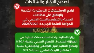 تصحيح شائعة عن تراجع الاستحقاقات الدستورية الخاصة بالإنفاق على قطاعات الصحة والتعليم والبحث العلمي