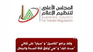 الأعلى للإعلام: غلق قناة “الصحة والجمال” ووقف برنامجين على قنوات “صدى البلد” و”هي”