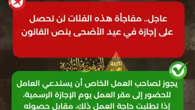 تصحيح عنوان مغلوط عن فئات من العمالة بالقطاع الخاص لا تستطيع أن تحصل على إجازة خلال عيد الأضحى. ينص القانون…