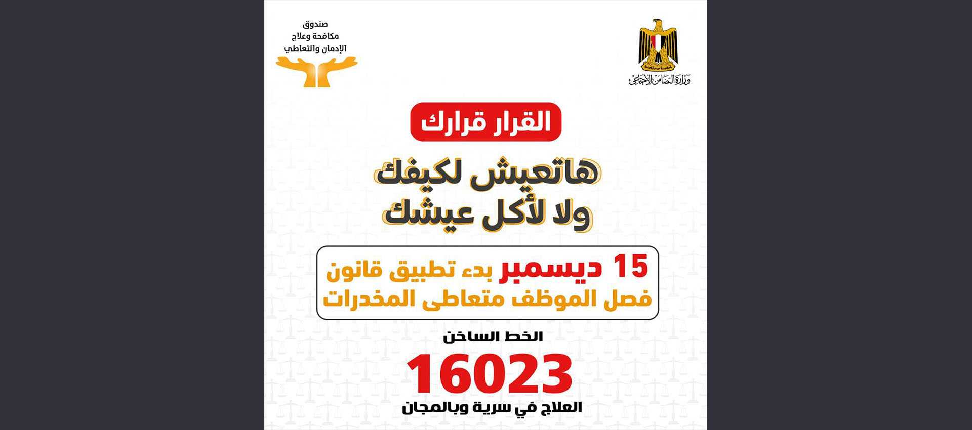 كما وجهت وزارة التضامن رسالة للموظفين،  لا يوجد بديل غير العلاج و على  متعاطى أي مواد مخدرة الإتصال بالخط الساخن لعلاج الإدمان “16023” للعلاج بسرية وأمان.